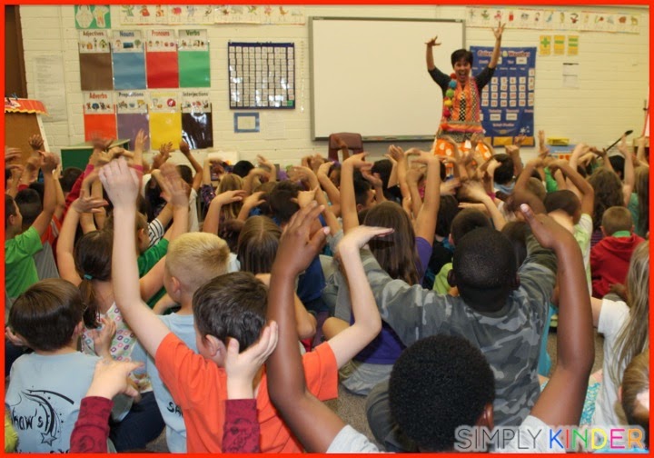 So here is our visit in pictures! The day was filled with songs, games, sign language, and movement from head to toe! Completely engaging and the entire campus was stopping by to see what on earth was going on in this classroom! {Not to mention I had at least 4 teachers and my principal tell me it was the best assembly they had ever seen and I have to agree!}