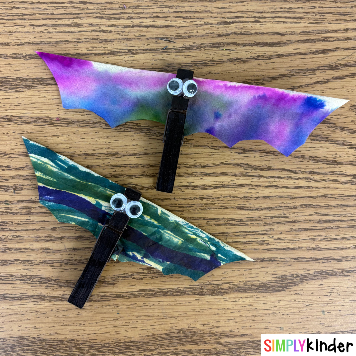 Color the clothespin black (or dark) if desired. Pinch the center of the filter, open the clothespin, and insert the filter so it “fans out” like wings. Add googly eyes for the finishing touch.