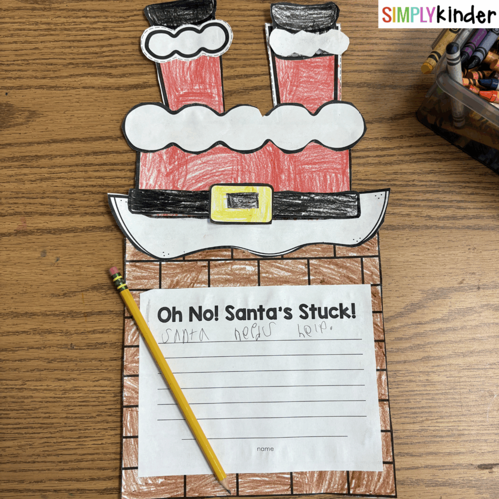 To extend the fun, the craft comes with matching writing pages where students complete prompts like “Oh No! Santa’s Stuck!” or add their own short narrative about how Santa ended up in this silly situation.