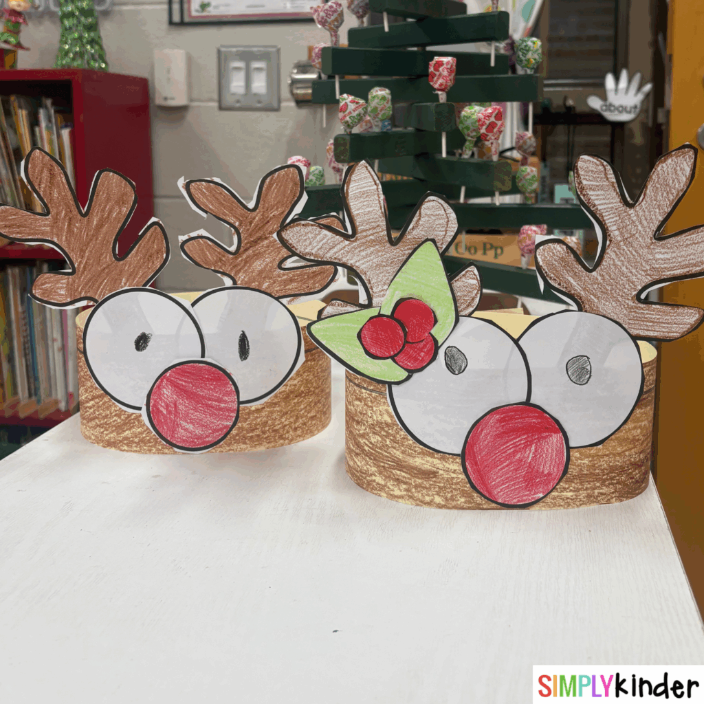 Become one of Santa’s sleigh-pulling crew by creating Reindeer Hats. Students cut and glue template pieces to make their own reindeer hat. These hats are perfect to make before listening to Dasher. Grab the FREE Reindeer hat at Simply Kinder + HERE.