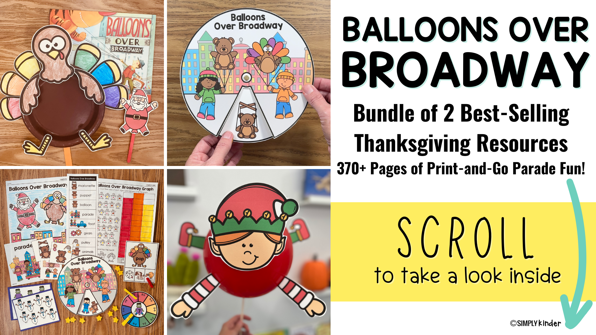 Make your November lesson plans unforgettable with this Balloons Over Broadway Bundle! Perfect for Preschool, Kindergarten, and First Grade, this bundle brings together over 370 pages of engaging, low-prep resources that blend literacy, math, STEM, and hands-on creativity—all inspired by the beloved Thanksgiving story Balloons Over Broadway by Melissa Sweet.