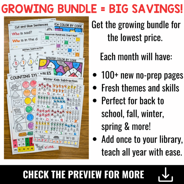 Add the January No-Prep Kindergarten Pack to your cart now, and don’t forget to upgrade to the Growing Bundle to get everything you need for all 12 months!