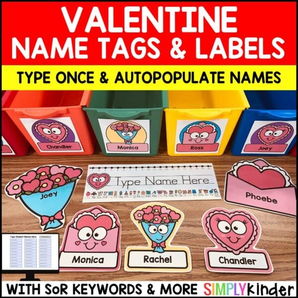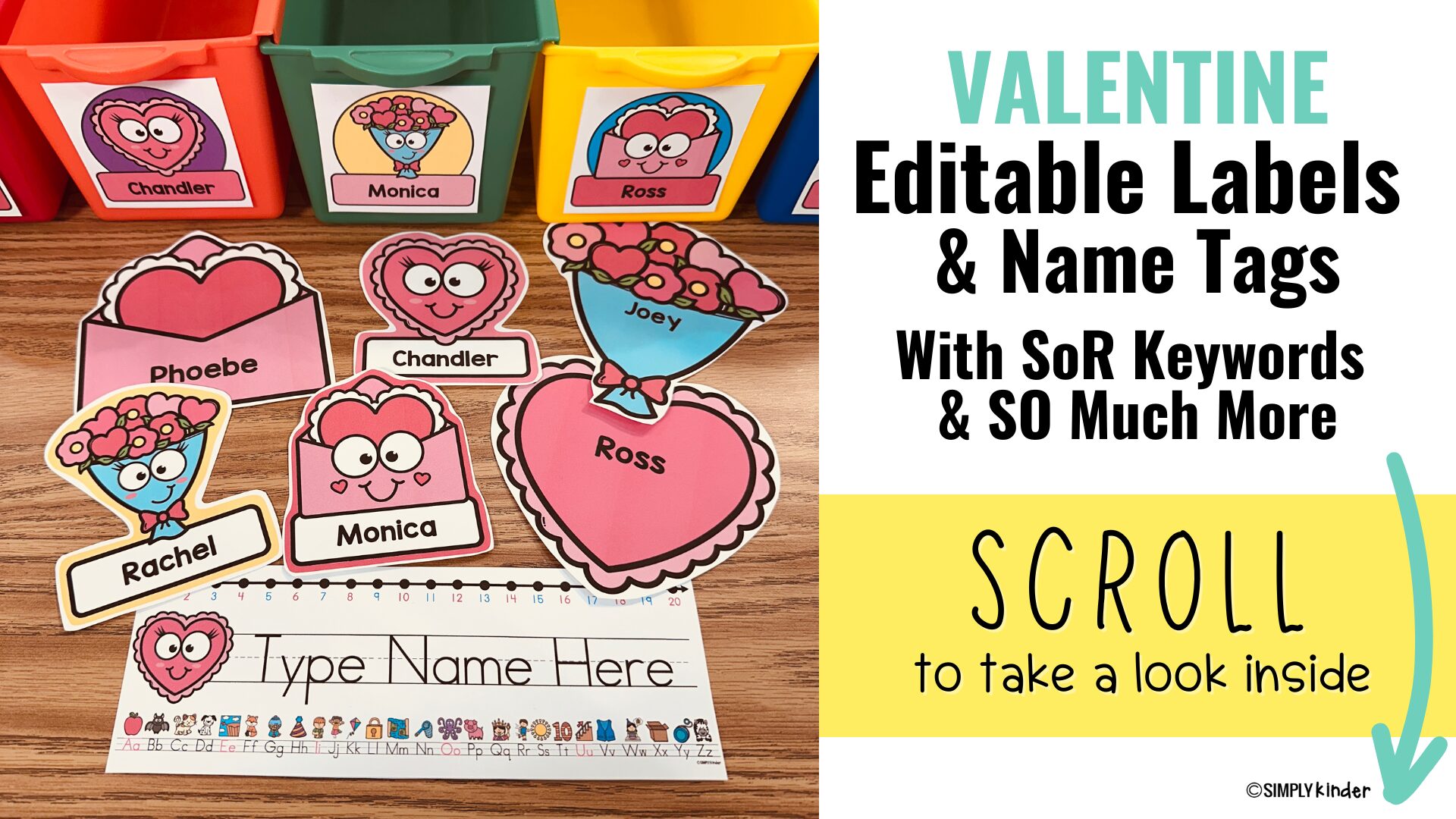 Valentines Day Themed Editable Kindergarten Name Tags or Desk Plates help provide your students not only with their name for their desk, but also key concepts they will work on all year including Science of Reading Aligned keywords for writing!